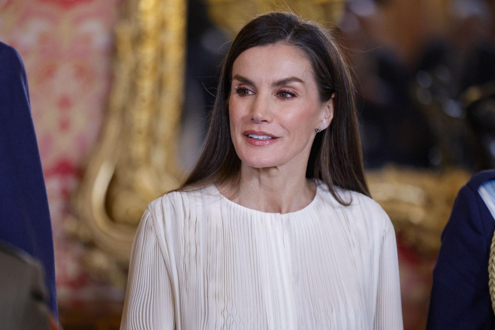 La prenda, confeccionada en un tejido plisado y semitransparente, ofrece un movimiento fluido y delicado que añade un toque de romanticismo a su apariencia. Con un cuello redondo y mangas largas acampanadas, la blusa incorpora detalles contemporáneos que la Reina ha sabido integrar en su guardarropa, equilibrando lo clásico con lo moderno. Este diseño, conocido como ‘Cloud Dancer’ por su ligereza y dinamismo, ejemplifica cómo Letizia Ortiz combina tradición y actualidad en su vestimenta, creando un estilo que es a la vez respetuoso con el protocolo y refrescantemente personal.